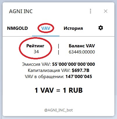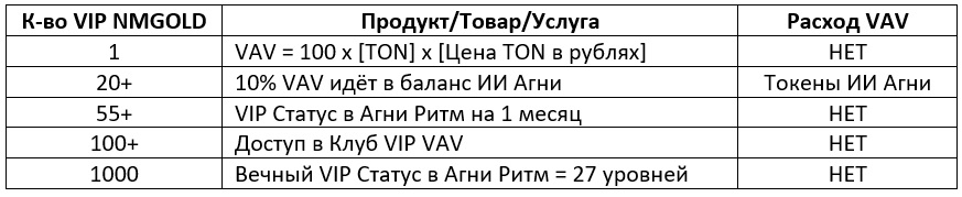 42. Токены VIP NMGOLD, отображаемые в мини-приложении системы Агни Ритм [5] – это токены NMGOLD, полученные только напрямую через смарт-контракт в блокчейне TON, и только такая форма их получения создаёт Рейтинг, записываемый в блокчейн TON для публичного долгосрочного хранения. Рейтинг лояльности к ASI Agni определяет приоритет на возможность обмена токенов VAV на все производимые ASI Agni материальные ценности.